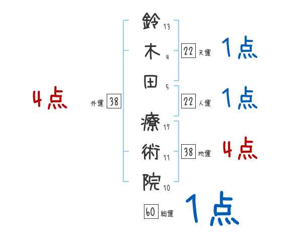 人運![]() | 鈴木田療術院さんの人運は22画の1つ星!努力することが苦手ないっぽう手先が器用。芸術性にも優れる。 性格や才能などを表す2番目に重要な運勢です。人間関係や協調性、社会的な成功に影響します。主に20歳から50歳ぐらいまでの中年期の運勢を表します。 |