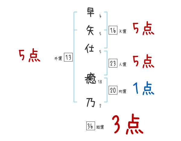 天運![]() | 早矢仕癒乃さんの天運は16画の5つ星!人望が厚く大きく発展する。逆転成功が見える。 家系が持つ宿命的な運勢を表します。祖先から受け継いだ苗字ですので自分の力が及びません。家柄を象徴します。 |