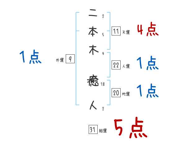 天運![]() | 二本木癒人さんの天運は11画の4つ星!着実に富や地位を得る幸運な人生。 家系が持つ宿命的な運勢を表します。祖先から受け継いだ苗字ですので自分の力が及びません。家柄を象徴します。 |