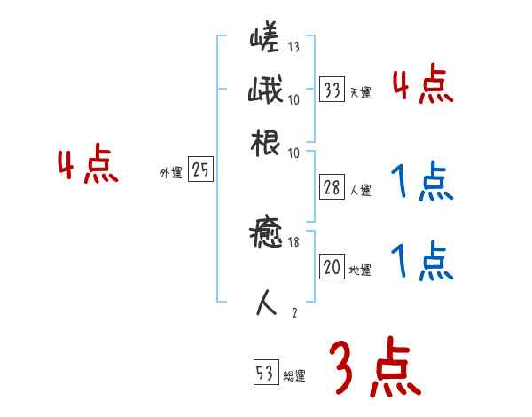 総運![]() | 嵯峨根癒人さんの総運は53画の3つ星!やや見栄っ張りで虚栄心がある。散財に注意。 あなたの人生を表す1番重要な運勢です。生涯を通じて影響する総合運となり、主に50歳以降の晩年期に影響を及ぼします。 |