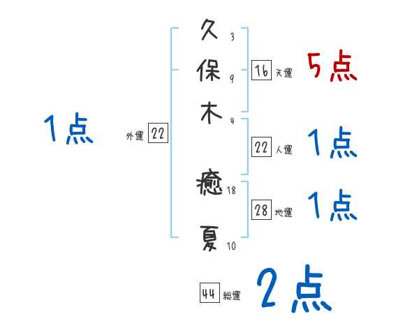 天運![]() | 久保木癒夏さんの天運は16画の5つ星!人望が厚く大きく発展する。逆転成功が見える。 家系が持つ宿命的な運勢を表します。祖先から受け継いだ苗字ですので自分の力が及びません。家柄を象徴します。 |