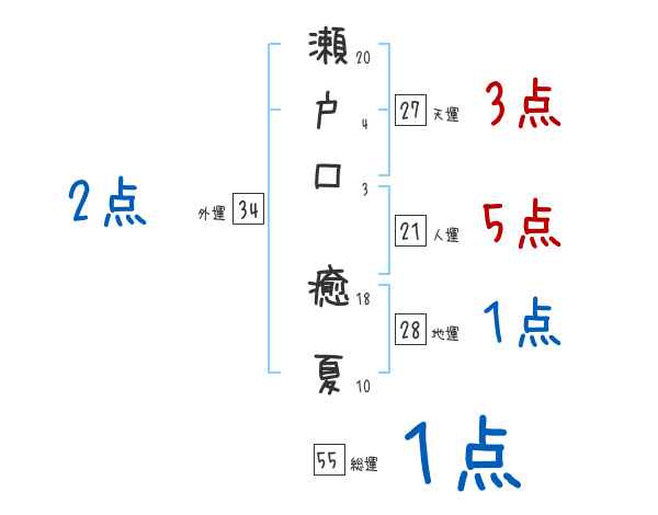 外運![]() | 瀬戸口癒夏さんの外運は34画の2つ星!独創性に優れるが、自尊心が強く災難に注意しましょう。 生活面を象徴する運勢です。外部から受ける影響力を表し、結婚運、家庭運や職場、環境への順応性を表します。 |