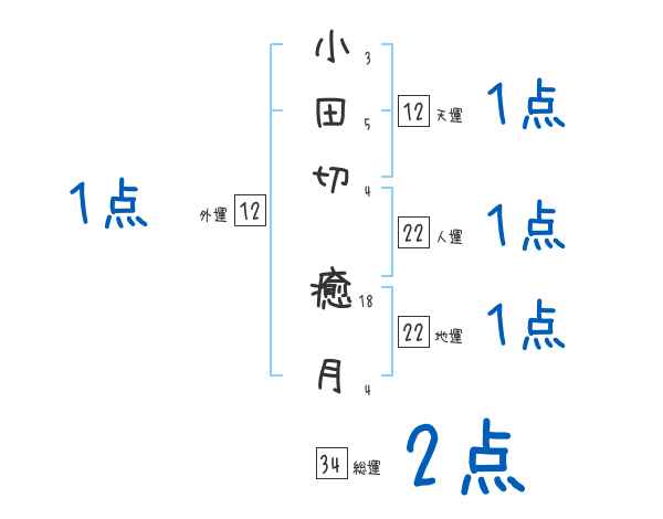 総運![]() | 小田切癒月さんの総運は34画の2つ星!独創性に優れるが、自尊心が強く災難に注意しましょう。 あなたの人生を表す1番重要な運勢です。生涯を通じて影響する総合運となり、主に50歳以降の晩年期に影響を及ぼします。 |