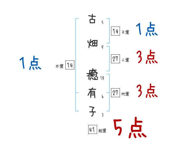 天運![]() | 古畑癒有子さんの天運は14画の1つ星!人に対して優しいがストレスを溜め込みがち。人間関係のトラブルを避けるよう気をつけましょう。 家系が持つ宿命的な運勢を表します。祖先から受け継いだ苗字ですので自分の力が及びません。家柄を象徴します。 |
