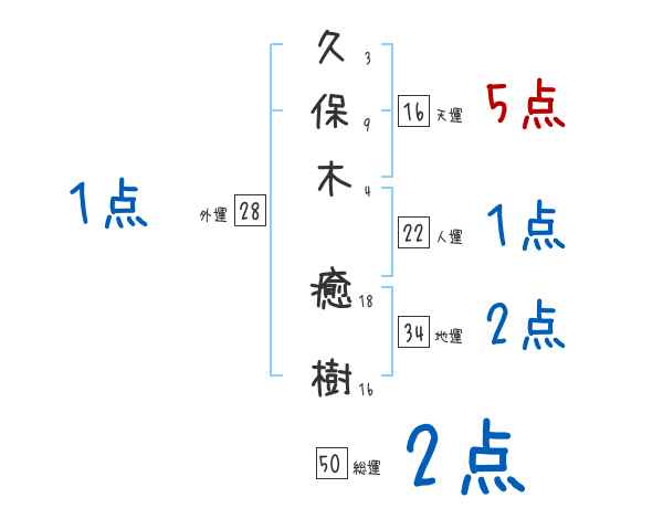 外運![]() | 久保木癒樹さんの外運は28画の1つ星!家庭環境に注意。スポーツで活躍できる能力があるかも。 生活面を象徴する運勢です。外部から受ける影響力を表し、結婚運、家庭運や職場、環境への順応性を表します。 |
