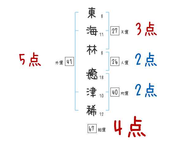 天運![]() | 東海林癒津稀さんの天運は27画の3つ星!頭脳明晰だが強情で摩擦が多い傾向。孤立に注意。 家系が持つ宿命的な運勢を表します。祖先から受け継いだ苗字ですので自分の力が及びません。家柄を象徴します。 |