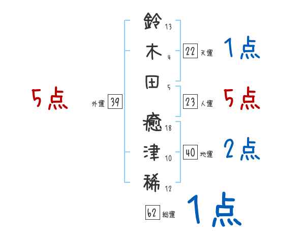 外運![]() | 鈴木田癒津稀さんの外運は39画の5つ星!社交性に優れ人望が厚い。人の上に立ち成功する。 生活面を象徴する運勢です。外部から受ける影響力を表し、結婚運、家庭運や職場、環境への順応性を表します。 |