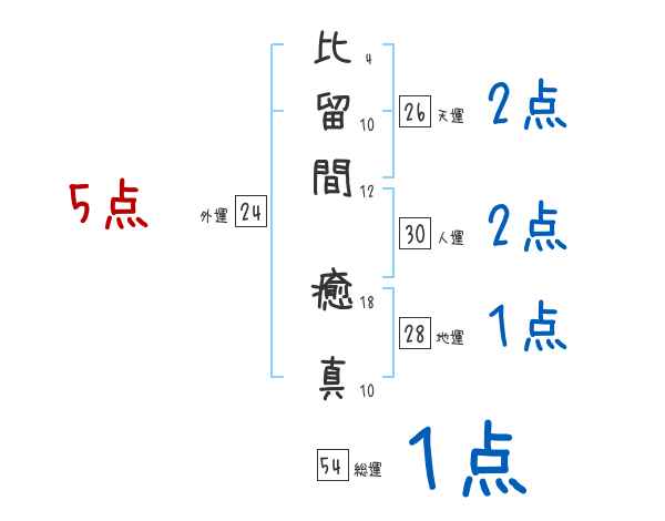 天運![]() | 比留間癒真さんの天運は26画の2つ星!波瀾万丈かも。信頼できる人を大事にしましょう。 家系が持つ宿命的な運勢を表します。祖先から受け継いだ苗字ですので自分の力が及びません。家柄を象徴します。 |