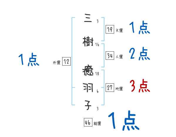 天運![]() | 三樹癒羽子さんの天運は19画の1つ星!優れた才能を持ちますが、協調性が足りないことも。周りの人と協力する事を意識しましょう。 家系が持つ宿命的な運勢を表します。祖先から受け継いだ苗字ですので自分の力が及びません。家柄を象徴します。 |