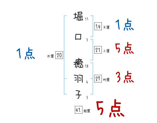 人運![]() | 堀口癒羽子さんの人運は21画の5つ星!統率力がある。独立し成功する。名誉を手に入れる。 性格や才能などを表す2番目に重要な運勢です。人間関係や協調性、社会的な成功に影響します。主に20歳から50歳ぐらいまでの中年期の運勢を表します。 |