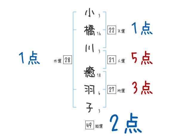 天運![]() | 小橋川癒羽子さんの天運は22画の1つ星!努力することが苦手ないっぽう手先が器用。芸術性にも優れる。 家系が持つ宿命的な運勢を表します。祖先から受け継いだ苗字ですので自分の力が及びません。家柄を象徴します。 |