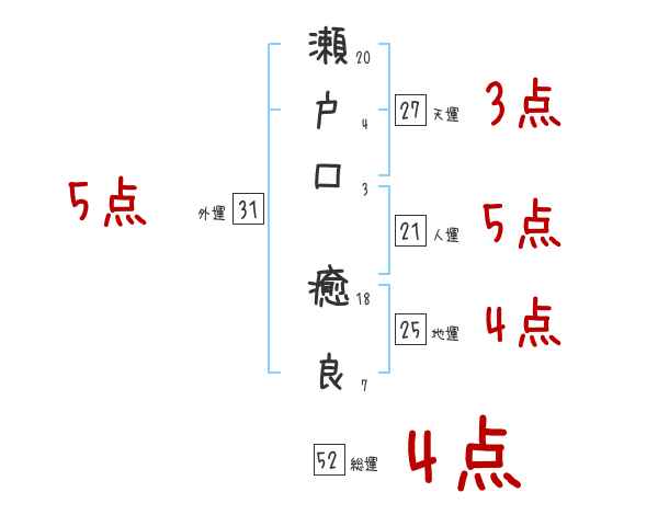 総運![]() | 瀬戸口癒良さんの総運は52画の4つ星!先見性と独創性に優れ考える力がある。強運の持ち主。 あなたの人生を表す1番重要な運勢です。生涯を通じて影響する総合運となり、主に50歳以降の晩年期に影響を及ぼします。 |