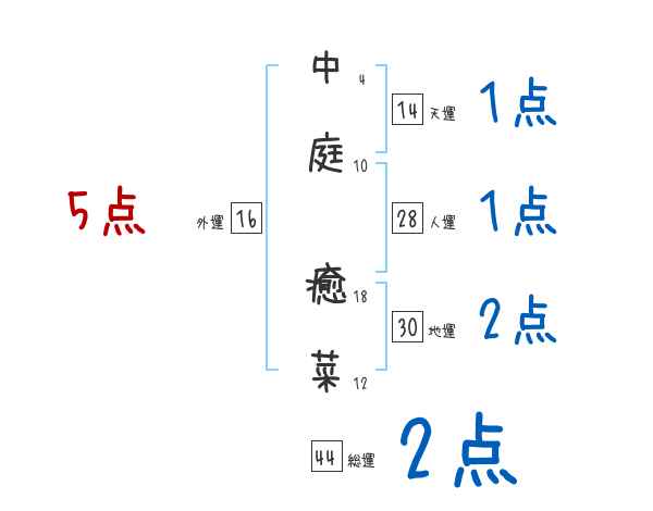 天運![]() | 中庭癒菜さんの天運は14画の1つ星!人に対して優しいがストレスを溜め込みがち。人間関係のトラブルを避けるよう気をつけましょう。 家系が持つ宿命的な運勢を表します。祖先から受け継いだ苗字ですので自分の力が及びません。家柄を象徴します。 |