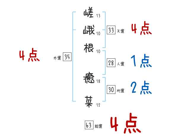 総運![]() | 嵯峨根癒菜さんの総運は63画の4つ星!家庭運がよく順調な生活。温和な性格。 あなたの人生を表す1番重要な運勢です。生涯を通じて影響する総合運となり、主に50歳以降の晩年期に影響を及ぼします。 |