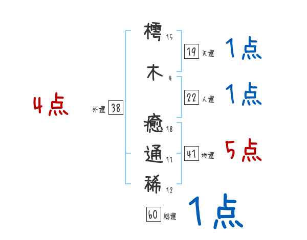 地運![]() | 樗木癒通稀さんの地運は41画の5つ星!大志を抱き、目標に向かって実力を発揮し達成する。温和な性格。 個性を表す基礎的な運勢です。性格形成や対人関係、行動力など家庭環境に影響されます。主に誕生してから20歳くらいまでの若年期の運勢を表します。 |