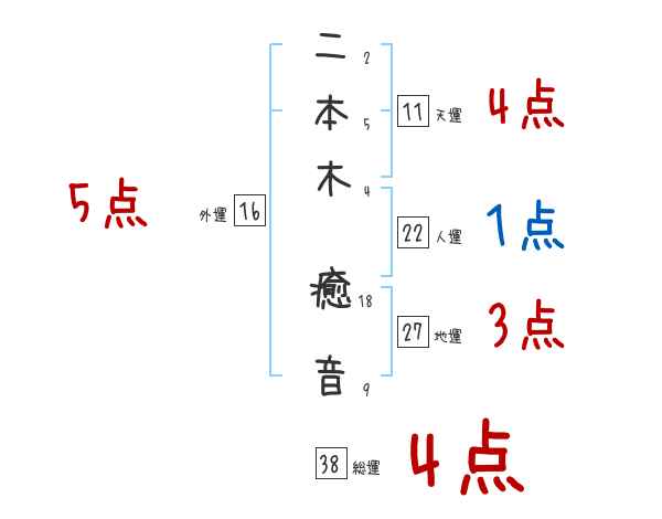 人運![]() | 二本木癒音さんの人運は22画の1つ星!努力することが苦手ないっぽう手先が器用。芸術性にも優れる。 性格や才能などを表す2番目に重要な運勢です。人間関係や協調性、社会的な成功に影響します。主に20歳から50歳ぐらいまでの中年期の運勢を表します。 |