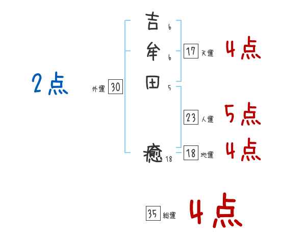 人運![]() | 吉牟田癒さんの人運は23画の5つ星!想像力に優れ活力がある。一代で成功し名誉を手に入れる。 性格や才能などを表す2番目に重要な運勢です。人間関係や協調性、社会的な成功に影響します。主に20歳から50歳ぐらいまでの中年期の運勢を表します。 |