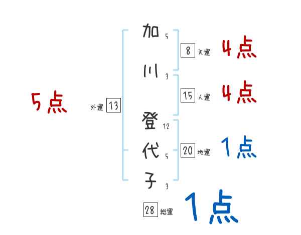 総運![]() | 加川登代子さんの総運は28画の1つ星!家庭環境に注意。スポーツで活躍できる能力があるかも。 あなたの人生を表す1番重要な運勢です。生涯を通じて影響する総合運となり、主に50歳以降の晩年期に影響を及ぼします。 |