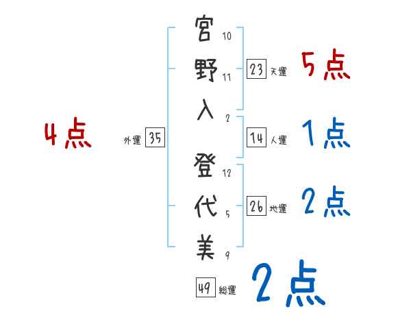 外運![]() | 宮野入登代美さんの外運は35画の4つ星!温厚な性格で感受性が高い。穏和な性格で人望が厚い。 生活面を象徴する運勢です。外部から受ける影響力を表し、結婚運、家庭運や職場、環境への順応性を表します。 |