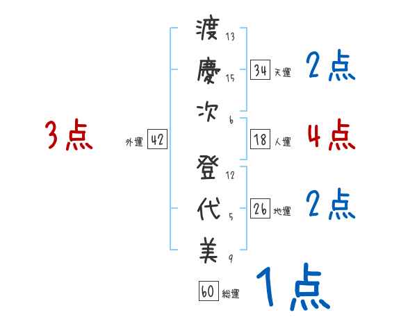 天運![]() | 渡慶次登代美さんの天運は34画の2つ星!独創性に優れるが、自尊心が強く災難に注意しましょう。 家系が持つ宿命的な運勢を表します。祖先から受け継いだ苗字ですので自分の力が及びません。家柄を象徴します。 |