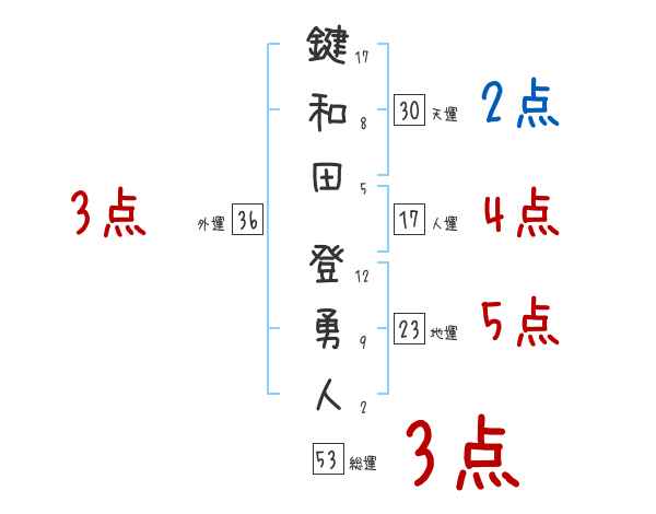 総運![]() | 鍵和田登勇人さんの総運は53画の3つ星!やや見栄っ張りで虚栄心がある。散財に注意。 あなたの人生を表す1番重要な運勢です。生涯を通じて影響する総合運となり、主に50歳以降の晩年期に影響を及ぼします。 |
