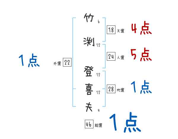 外運![]() | 竹渕登喜夫さんの外運は22画の1つ星!努力することが苦手ないっぽう手先が器用。芸術性にも優れる。 生活面を象徴する運勢です。外部から受ける影響力を表し、結婚運、家庭運や職場、環境への順応性を表します。 |