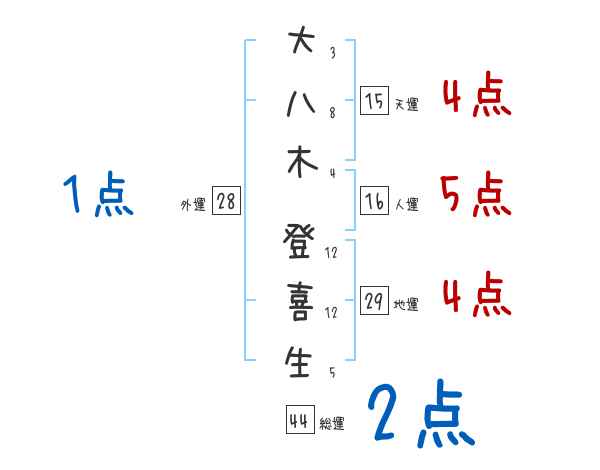 総運![]() | 大八木登喜生さんの総運は44画の2つ星!誠実で慎重な性格。物事を考えすぎないように注意しましょう。 あなたの人生を表す1番重要な運勢です。生涯を通じて影響する総合運となり、主に50歳以降の晩年期に影響を及ぼします。 |