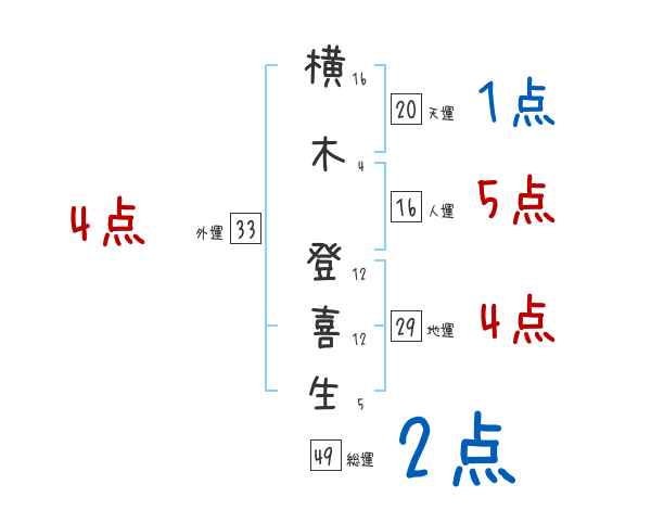 外運![]() | 横木登喜生さんの外運は33画の4つ星!権力志向でプライドが高い。勇気があり運を切り開き成功する。 生活面を象徴する運勢です。外部から受ける影響力を表し、結婚運、家庭運や職場、環境への順応性を表します。 |