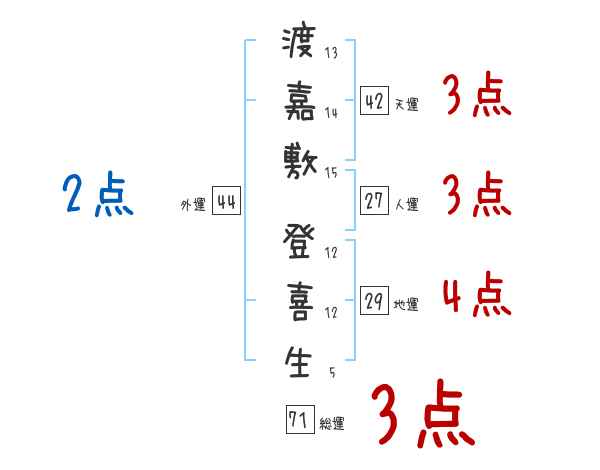 外運![]() | 渡嘉敷登喜生さんの外運は44画の2つ星!誠実で慎重な性格。物事を考えすぎないように注意しましょう。 生活面を象徴する運勢です。外部から受ける影響力を表し、結婚運、家庭運や職場、環境への順応性を表します。 |