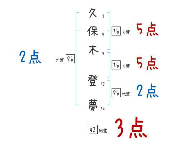 人運![]() | 久保木登夢さんの人運は16画の5つ星!人望が厚く大きく発展する。逆転成功が見える。 性格や才能などを表す2番目に重要な運勢です。人間関係や協調性、社会的な成功に影響します。主に20歳から50歳ぐらいまでの中年期の運勢を表します。 |