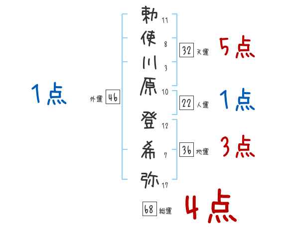天運![]() | 勅使川原登希弥さんの天運は32画の5つ星!柔軟性があり成功する。チャンスが多く金運が良い。 家系が持つ宿命的な運勢を表します。祖先から受け継いだ苗字ですので自分の力が及びません。家柄を象徴します。 |