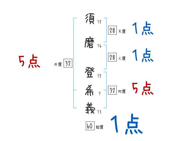 外運![]() | 須磨登希義さんの外運は32画の5つ星!柔軟性があり成功する。チャンスが多く金運が良い。 生活面を象徴する運勢です。外部から受ける影響力を表し、結婚運、家庭運や職場、環境への順応性を表します。 |