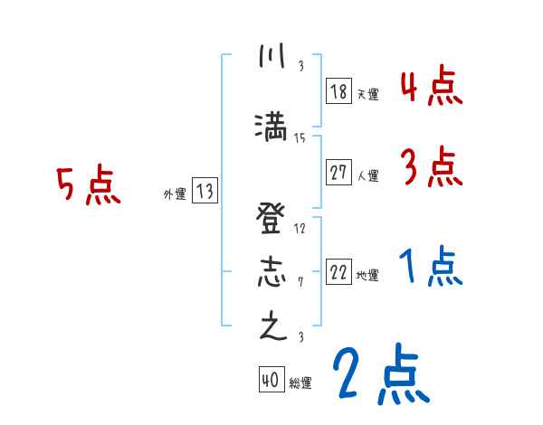 天運![]() | 川満登志之さんの天運は18画の4つ星!情熱的で剛気。忍耐力があり信頼される。 家系が持つ宿命的な運勢を表します。祖先から受け継いだ苗字ですので自分の力が及びません。家柄を象徴します。 |