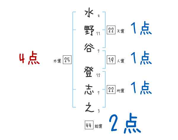 天運![]() | 水野谷登志之さんの天運は22画の1つ星!努力することが苦手ないっぽう手先が器用。芸術性にも優れる。 家系が持つ宿命的な運勢を表します。祖先から受け継いだ苗字ですので自分の力が及びません。家柄を象徴します。 |
