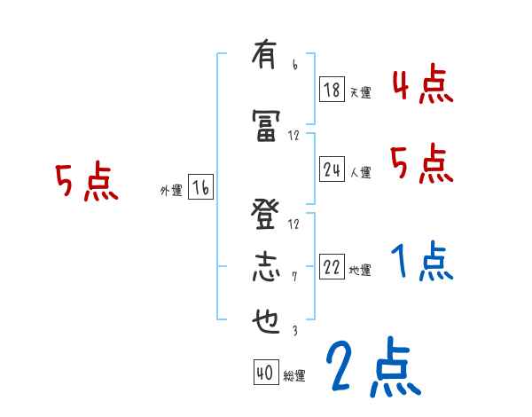 外運![]() | 有冨登志也さんの外運は16画の5つ星!人望が厚く大きく発展する。逆転成功が見える。 生活面を象徴する運勢です。外部から受ける影響力を表し、結婚運、家庭運や職場、環境への順応性を表します。 |