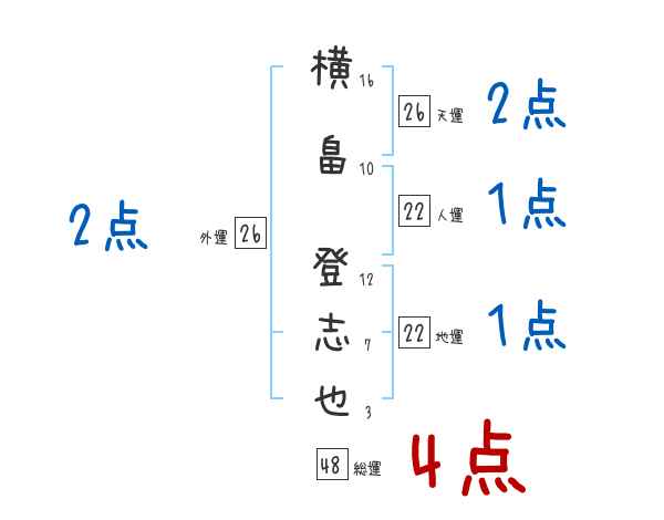 天運![]() | 横畠登志也さんの天運は26画の2つ星!波瀾万丈かも。信頼できる人を大事にしましょう。 家系が持つ宿命的な運勢を表します。祖先から受け継いだ苗字ですので自分の力が及びません。家柄を象徴します。 |