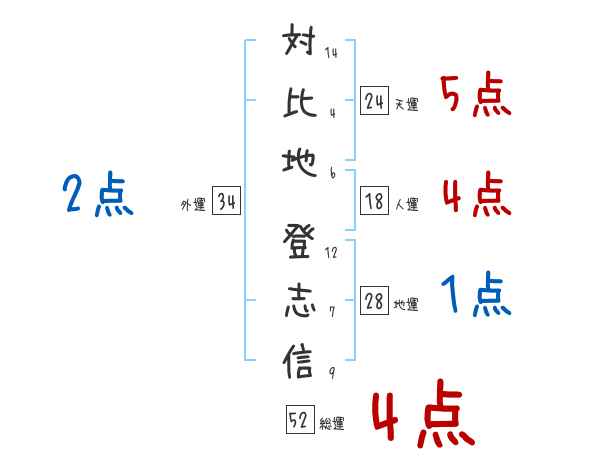 外運![]() | 対比地登志信さんの外運は34画の2つ星!独創性に優れるが、自尊心が強く災難に注意しましょう。 生活面を象徴する運勢です。外部から受ける影響力を表し、結婚運、家庭運や職場、環境への順応性を表します。 |