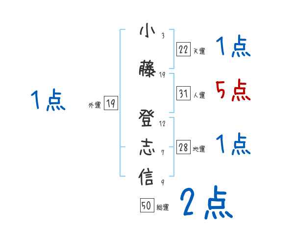 総運![]() | 小藤登志信さんの総運は50画の2つ星!浮き沈みが激しく不安定。しりすぼみに衰退しやすいので注意しましょう。 あなたの人生を表す1番重要な運勢です。生涯を通じて影響する総合運となり、主に50歳以降の晩年期に影響を及ぼします。 |