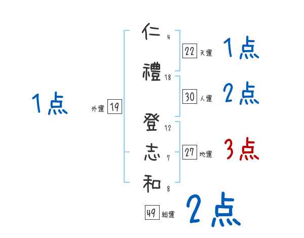 人運![]() | 仁禮登志和さんの人運は30画の2つ星!浮き沈みの激しさに注意しましょう。 性格や才能などを表す2番目に重要な運勢です。人間関係や協調性、社会的な成功に影響します。主に20歳から50歳ぐらいまでの中年期の運勢を表します。 |