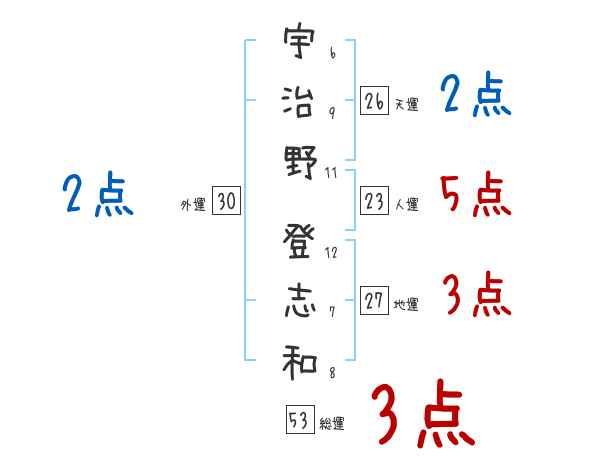 総運![]() | 宇治野登志和さんの総運は53画の3つ星!やや見栄っ張りで虚栄心がある。散財に注意。 あなたの人生を表す1番重要な運勢です。生涯を通じて影響する総合運となり、主に50歳以降の晩年期に影響を及ぼします。 |