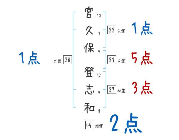 外運![]() | 宮久保登志和さんの外運は28画の1つ星!家庭環境に注意。スポーツで活躍できる能力があるかも。 生活面を象徴する運勢です。外部から受ける影響力を表し、結婚運、家庭運や職場、環境への順応性を表します。 |