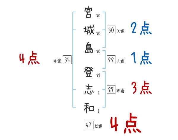 総運![]() | 宮城島登志和さんの総運は57画の4つ星!向上心があり人望がある。地位を得る。 あなたの人生を表す1番重要な運勢です。生涯を通じて影響する総合運となり、主に50歳以降の晩年期に影響を及ぼします。 |