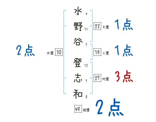 天運![]() | 水野谷登志和さんの天運は22画の1つ星!努力することが苦手ないっぽう手先が器用。芸術性にも優れる。 家系が持つ宿命的な運勢を表します。祖先から受け継いだ苗字ですので自分の力が及びません。家柄を象徴します。 |