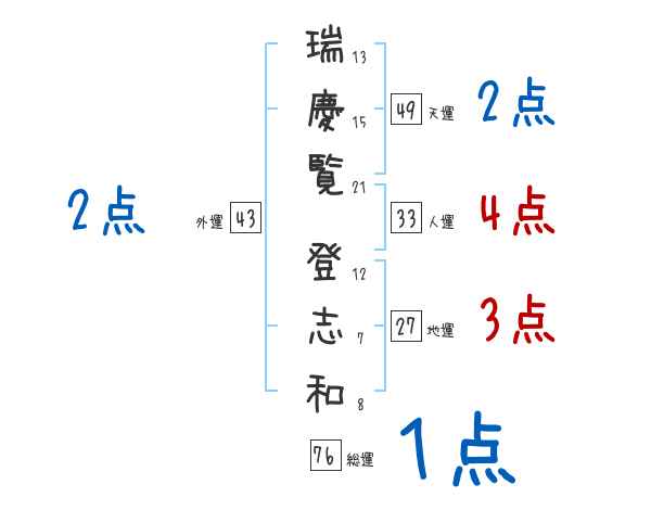 天運![]() | 瑞慶覧登志和さんの天運は49画の2つ星!不安定な性格で明暗がある人生。周りの人には支援されやすい。 家系が持つ宿命的な運勢を表します。祖先から受け継いだ苗字ですので自分の力が及びません。家柄を象徴します。 |