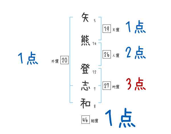 天運![]() | 矢熊登志和さんの天運は19画の1つ星!優れた才能を持ちますが、協調性が足りないことも。周りの人と協力する事を意識しましょう。 家系が持つ宿命的な運勢を表します。祖先から受け継いだ苗字ですので自分の力が及びません。家柄を象徴します。 |