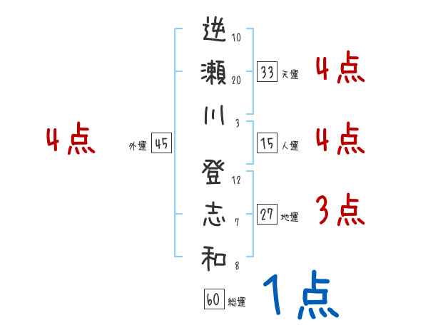 天運![]() | 逆瀬川登志和さんの天運は33画の4つ星!権力志向でプライドが高い。勇気があり運を切り開き成功する。 家系が持つ宿命的な運勢を表します。祖先から受け継いだ苗字ですので自分の力が及びません。家柄を象徴します。 |