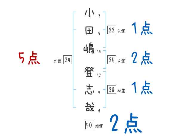 天運![]() | 小田嶋登志哉さんの天運は22画の1つ星!努力することが苦手ないっぽう手先が器用。芸術性にも優れる。 家系が持つ宿命的な運勢を表します。祖先から受け継いだ苗字ですので自分の力が及びません。家柄を象徴します。 |