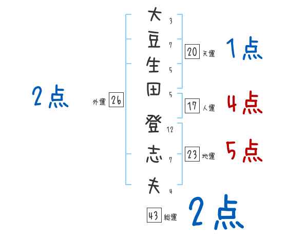 総運![]() | 大豆生田登志夫さんの総運は43画の2つ星!頑固な性格で独立心が強いかも。やや非現実的で浪費に注意しましょう。 あなたの人生を表す1番重要な運勢です。生涯を通じて影響する総合運となり、主に50歳以降の晩年期に影響を及ぼします。 |