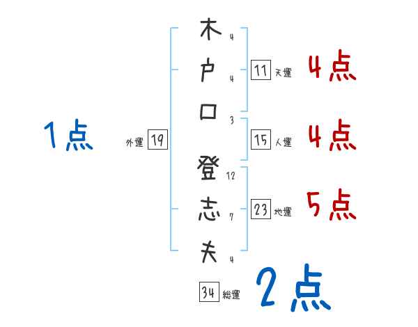 総運![]() | 木戸口登志夫さんの総運は34画の2つ星!独創性に優れるが、自尊心が強く災難に注意しましょう。 あなたの人生を表す1番重要な運勢です。生涯を通じて影響する総合運となり、主に50歳以降の晩年期に影響を及ぼします。 |