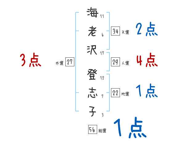 外運![]() | 海老沢登志子さんの外運は27画の3つ星!頭脳明晰だが強情で摩擦が多い傾向。孤立に注意。 生活面を象徴する運勢です。外部から受ける影響力を表し、結婚運、家庭運や職場、環境への順応性を表します。 |